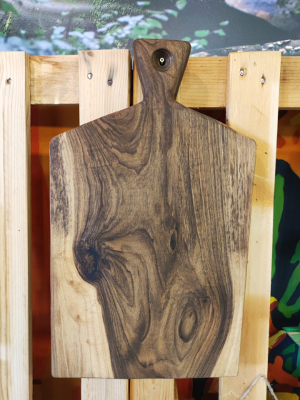 Jasna deska o ciekawym kształcie do krojenia lub podawania z drewna orzecha, ręcznie wykonana. Autor: Grzegorz Jurczak