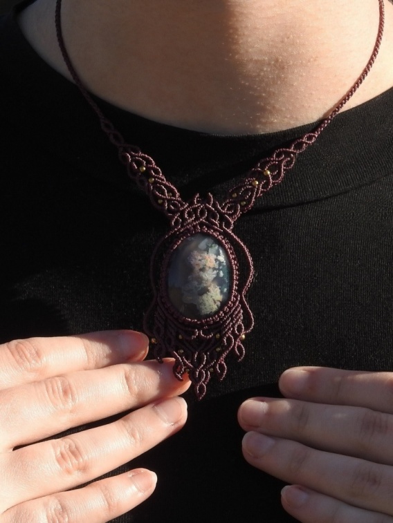 Unikatowy naszyjnik makramowy z agatem mszystym z koralikami ze stali chirurgicznej w kolorze złotym. Naszyjnik został ręcznie wykonany techniką mikromakramy. Biżuteria makramowa to niezwykła sztuka tworzenia biżuterii ze sznurka, polegająca na wiązaniu supełków i łączeniu ich w rozbudowane, artystyczne wzory. Naszyjnik na wiązanie z tyłu.